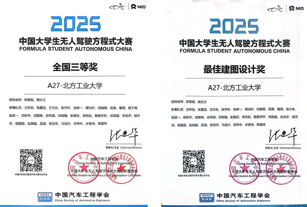 11月18日至23日,由中國科學(xué)技術(shù)協(xié)會指導(dǎo)、中國汽車工程學(xué)會主辦的2025“蔚來杯”中國大學(xué)生方程式系列賽事在安徽合肥燃情開賽。我校在此次比賽中取得驕人成績,獲得電車總成績?nèi)珖坏泉劇o人車全國三等獎,電車效率測試第五名、耐久比賽第十一名、成本與制造分析第十三名,A27無人車獲評“最佳建圖設(shè)計獎”,指導(dǎo)老師陳智剛獲評“優(yōu)秀指導(dǎo)老師”稱號,用實力書寫了北方工業(yè)大學(xué)在大學(xué)生汽車工程領(lǐng)域的亮眼答卷。