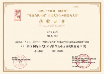 近日,2025“外研社·國才杯”“理解當代中國”全國大學生外語能力大賽北京賽區省賽落幕,北方工業大學國際學生團隊在國際中文組中文短視頻賽項中斬獲三項銀獎,充分展現了學校國際學生教育的扎實成效與國際學生的中文應用實力。