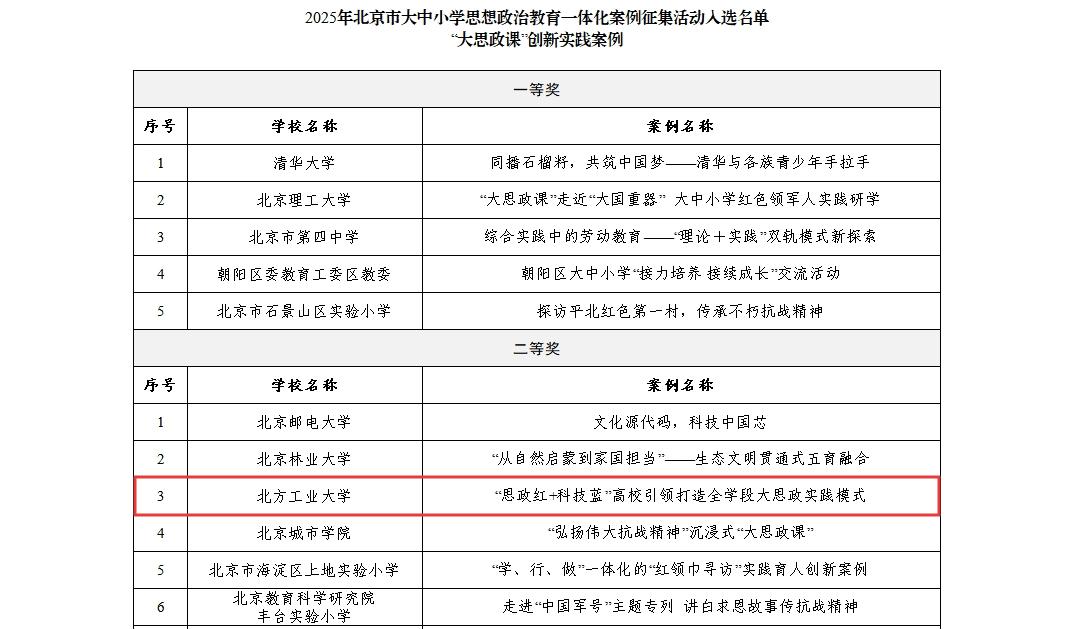 近日,2025年北京市大中小學思想政治教育一體化主題活動案例征集評審結果公布,我校機械與材料工程學院申報的《“思政紅+科技藍”高校引領打造全學段立體化大思政實踐模式》獲“大思政課”創(chuàng)新實踐案例二等獎,電氣與控制工程學院申報的《大中小學貫通·家校社政協(xié)同:智能機器人一體化教學》獲課程思政特色教學案例優(yōu)秀獎。