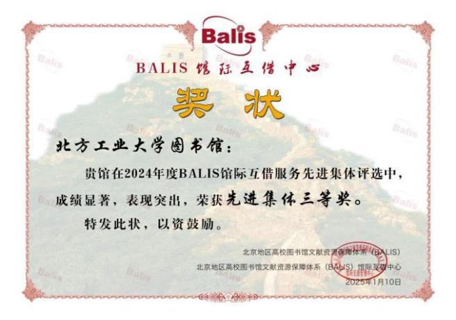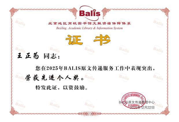副館長崔澤永榮獲“北京地區高校圖書館優秀館長”稱號,采編部主任鐘凱榮獲“北京地區高校圖書館優秀館員”稱號。在北京高校網絡圖書館(網圖)聯盟舉辦的“優秀大學生管理員”評選中,21 名 “藍馬甲” 學生館員榮獲該殊榮。在2024年度BALIS館際互借服務先進評選中,圖書館榮獲“先進集體三等獎”,借閱部主任(代)袁伶俐榮獲“先進個人二等獎”。2025年BALIS原文傳遞服務工資評選中,圖書館榮獲“BALIS 原文傳遞先進集體獎”,咨詢部館員王正為榮獲“先進個人獎”。