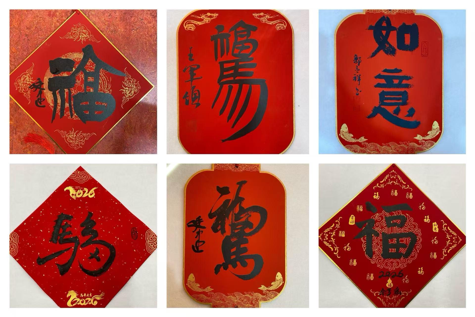 活動現場,書法家們與師生親切交流,從握筆姿勢到運筆技巧,從章法布局到藝術意境,耐心細致地進行指導。師生們在紅色宣紙上揮毫書寫,一幅幅筆力遒勁的“福”字、一對對寓意美好的春聯在筆墨流轉間誕生。現場創作的“慶祝北方工業大學建校80周年”“服務暖心,勞動育人”等作品,既展現了學校厚重的辦學歷史,也體現了以文化人的教育理念。