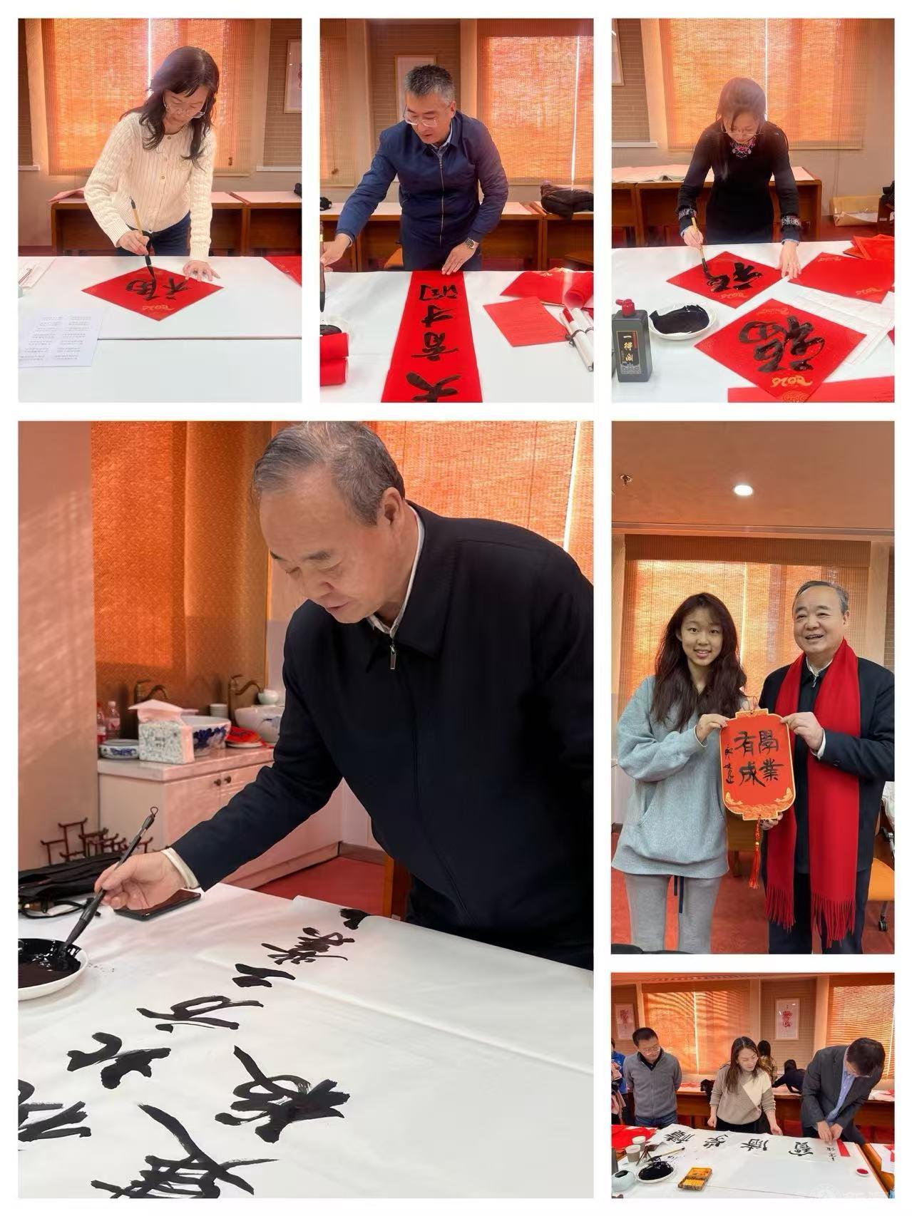 活動特邀中國書法家協會理事、北京書法家協會副主席郭孟祥,中國世界民族文化交流促進會副會長、北京書協理事廖廷建,中國書法家協會會員、北京國風書畫教育學會副會長王軍領等三位書法名家,與我校鄭泰平、熊玲、陳文芳等老師一同鋪紙研墨,共書新春祝福。