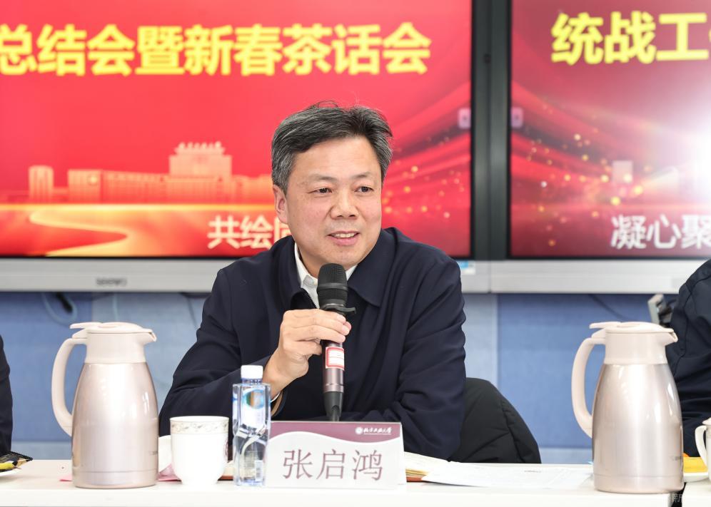 張啟鴻代表學(xué)校黨委向全校統(tǒng)戰(zhàn)成員和統(tǒng)戰(zhàn)干部致以誠摯的問候和新春祝福,充分肯定了過去一年統(tǒng)戰(zhàn)工作取得的成績,并就進(jìn)一步做好統(tǒng)戰(zhàn)工作提出要求。他表示,學(xué)校各民主黨派基層組織、統(tǒng)戰(zhàn)團(tuán)體組織健全氛圍好,統(tǒng)戰(zhàn)成員干事創(chuàng)業(yè)成效好,人大代表政協(xié)委員盡職奉獻(xiàn)影響好,為學(xué)校各項(xiàng)事業(yè)發(fā)展貢獻(xiàn)了不可或缺的智慧和力量。他強(qiáng)調(diào),2026年是實(shí)施“十五五”規(guī)劃的開局起步之年,也是學(xué)校加快高質(zhì)量發(fā)展的重要一年,學(xué)校統(tǒng)一戰(zhàn)線要堅(jiān)持圍繞中心、服務(wù)大局,進(jìn)一步發(fā)揮法寶作用,強(qiáng)化思想政治引領(lǐng),加強(qiáng)黨派團(tuán)體自身建設(shè)和黨外人士隊(duì)伍建設(shè),夯實(shí)統(tǒng)戰(zhàn)工作責(zé)任制,完善大統(tǒng)戰(zhàn)工作格局,為建設(shè)特色鮮明、優(yōu)勢突出的高水平工科大學(xué)凝聚人心、匯聚力量。