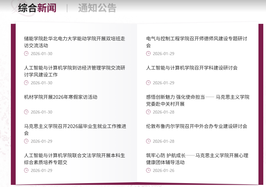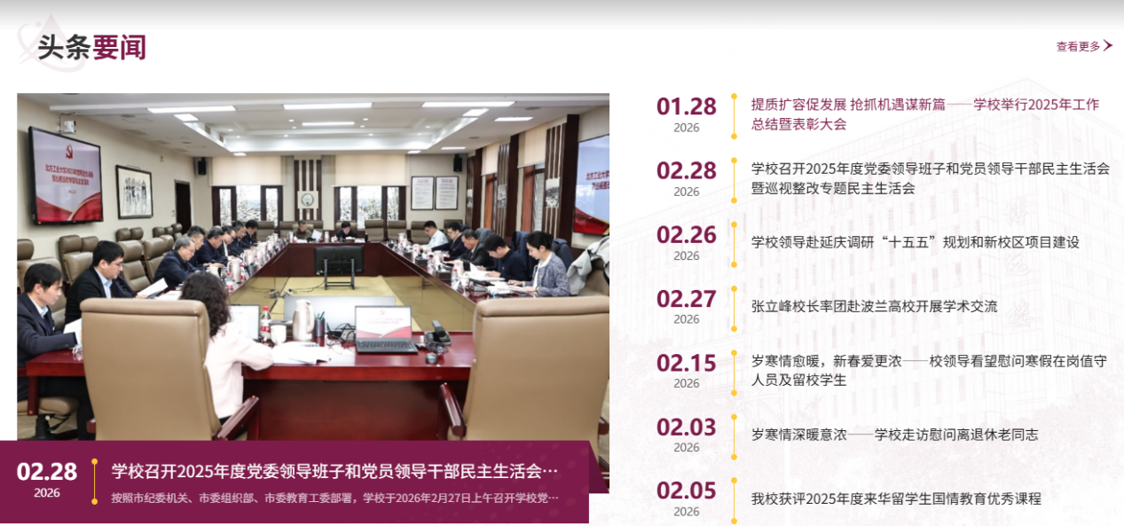 “學校要聞”采用新聞圖片+新聞列表方式展示,“一主多輔”,突出新聞重點,兼顧信息全面性。