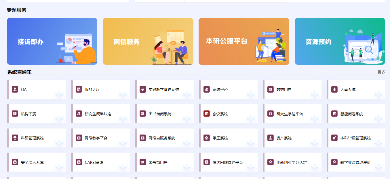 2.升級完善“一網通辦”功能。強化“一站式”服務,“系統直通車”直通校內各個服務系統,高效辦理網上業務。