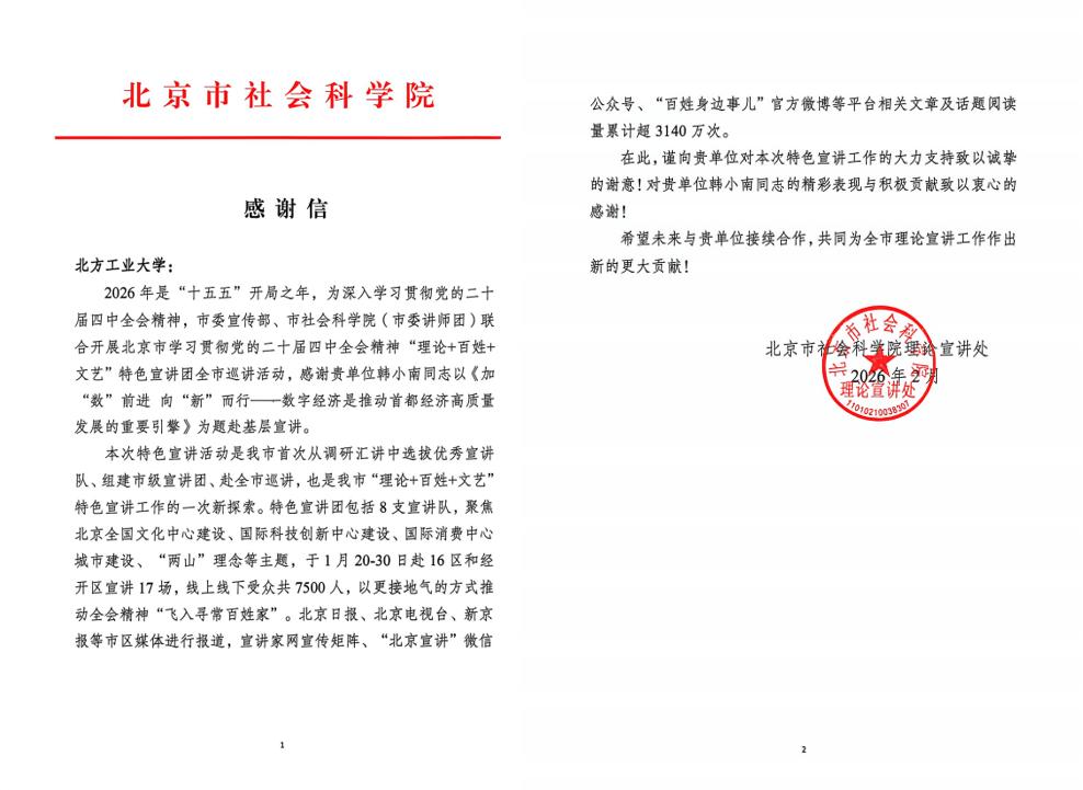 近日,由北京市委宣傳部、市社會科學院(市委講師團)聯合主辦的2025年北京市“理論+百姓+文藝”特色宣講調研匯講活動公布評選結果。我校馬克思主義學院副教授韓小南所作的《數字經濟是推動中國式現代化建設的重要引擎》宣講報告,榮獲二等獎。