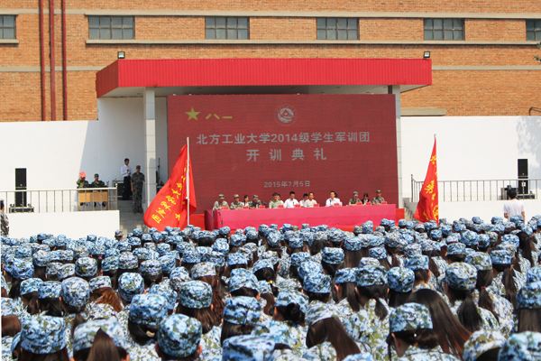 在雄壯的解放軍進行曲之后,郭玉良副書記宣布了北方工業大學2014級軍訓團成立的決定、軍訓團干部名單,并為軍訓團授團旗、連旗。軍訓團團長、中國人民解放軍66188部隊副參謀長汪榮作了熱情而振奮的軍訓動員。機械學院材料14-2班張昊代表學生發言,表達了不畏艱苦,服從命令,高標準完成訓練任務的決心。郭睿代表教官發言,表示將盡心盡責,合理安排訓練任務,科學施訓,確保高質量完成軍訓任務。在軍訓團副團長安雪峰的帶領下,同學們高舉右拳,莊嚴宣誓。隨后,承訓部隊表演了分列式、隊列動作、軍體拳、腰帶擒敵術等訓練科目,教官們令人震撼的氣勢和颯爽的英姿贏得了同學們的陣陣掌聲。