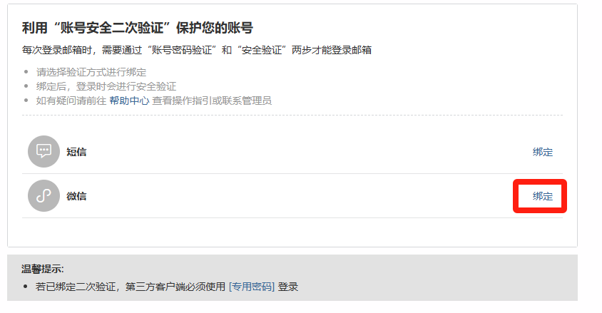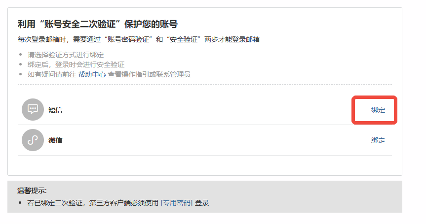 1.已綁定用戶:通過企業微信、FoxmailOutlook等第三方客戶端需要重登錄,登錄必須使用【客戶端專用密碼】與日常登錄密碼不同)。