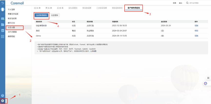 c)     客戶端專用密碼設置,設置-》安全設置-》客戶端專用密碼,客戶端密碼可設置多個但每個只顯示一次