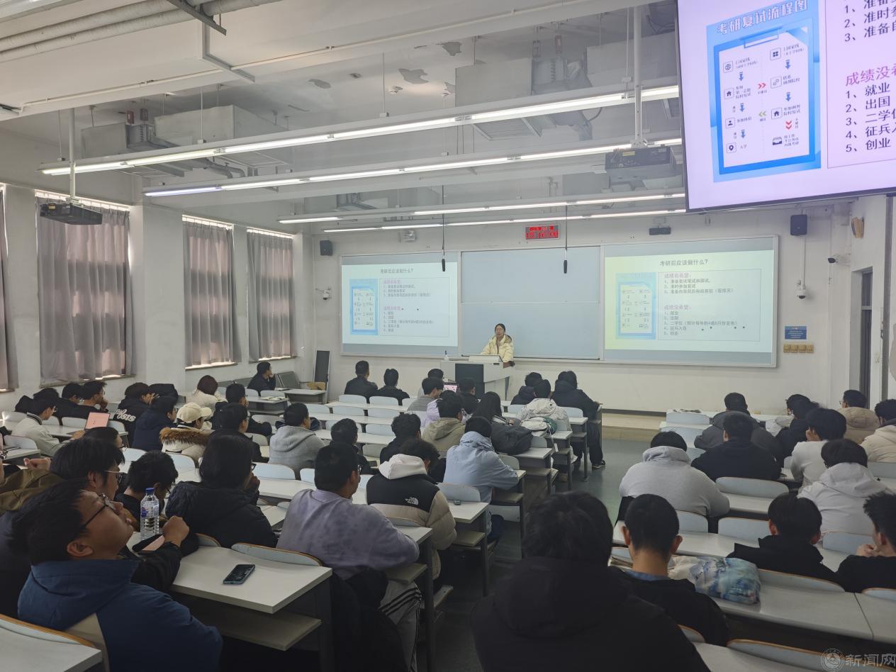 輔導員王鑫淼對畢業生去向進行全面梳理。通過詳實的數據,分別就考研復試與調劑、企業就業、出國深造、征兵入伍以及“西部計劃”等不同路徑進行講解,幫助畢業生全面了解各類畢業選擇。王老師同時提醒大家注意畢業學分獲得,增強就業防詐意識。做到心中有數、腳下有路。
