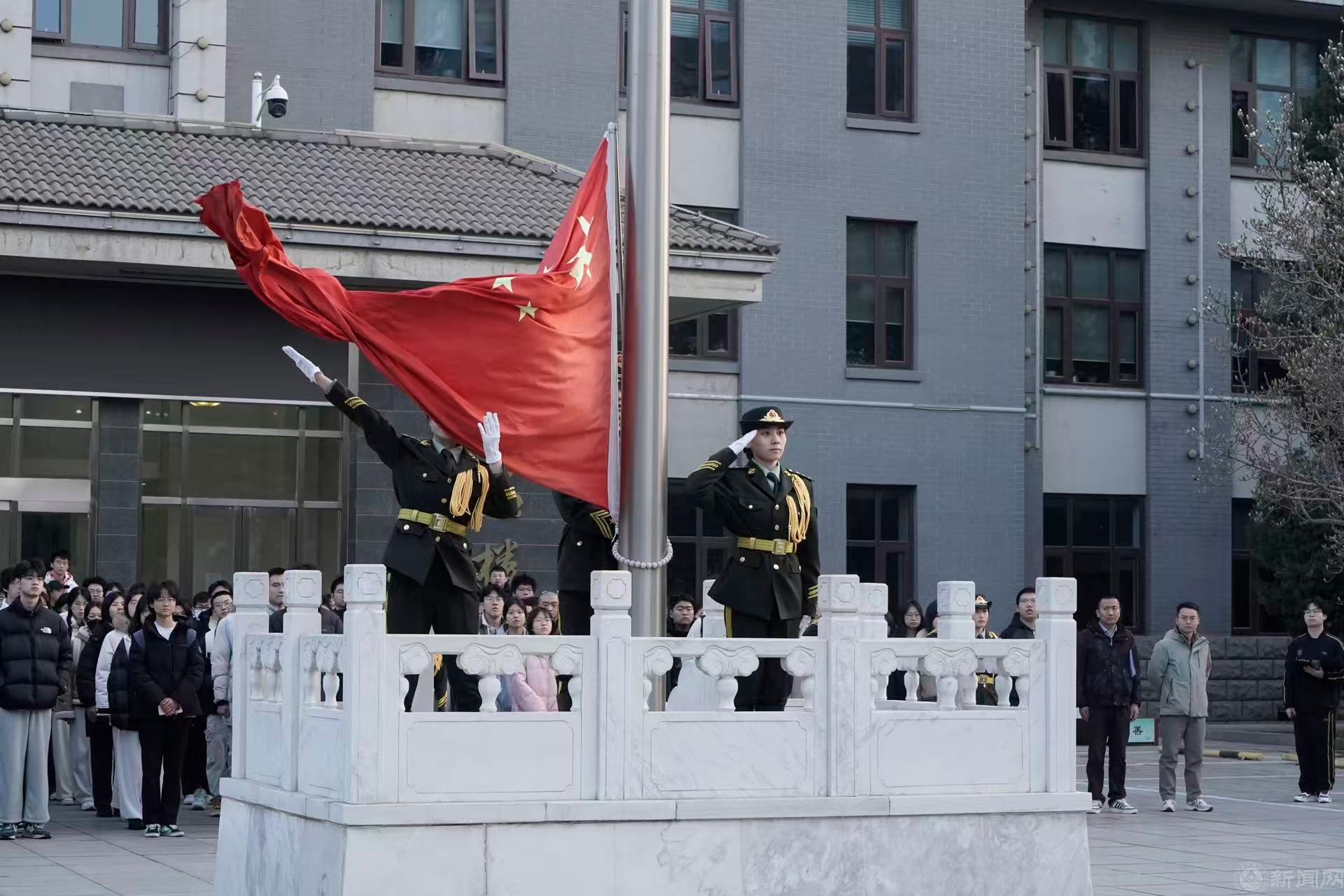 晨光初露,國旗護衛隊邁著鏗鏘有力的步伐護送國旗走向升旗臺。伴隨著雄壯的《義勇軍進行曲》,五星紅旗冉冉升起,全體師生肅立行注目禮。