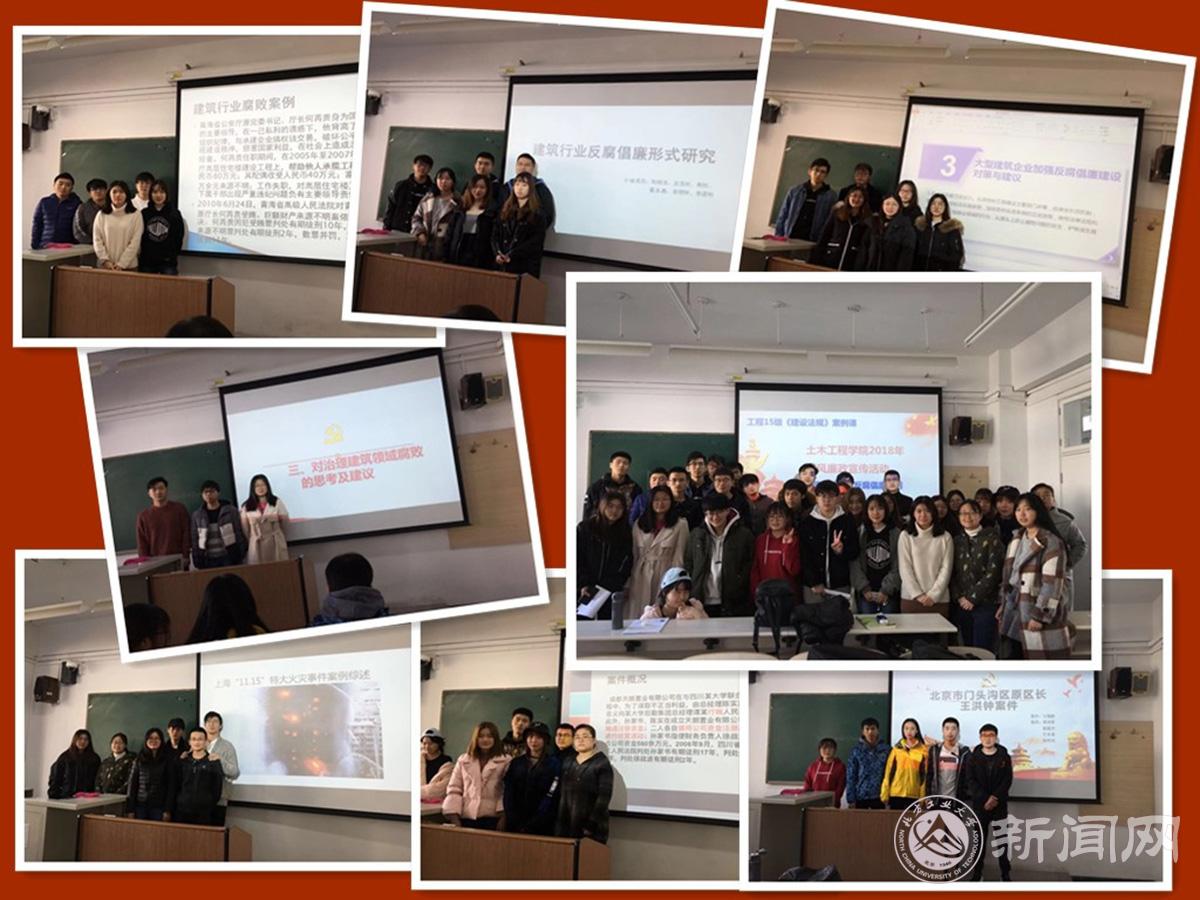 為深入學習貫徹黨的十九大精神,全力推動習近平新時代中國特色社會主義思想“進教材、進課堂、進頭腦”,作為學校2018年黨風廉政宣傳教育重點活動之一,近日,土木工程學院結合工程管理專業2015級畢業班的《建設法規》課程,開展了“建筑行業反腐倡廉警示教育進課堂”活動,并進行了成果展示。