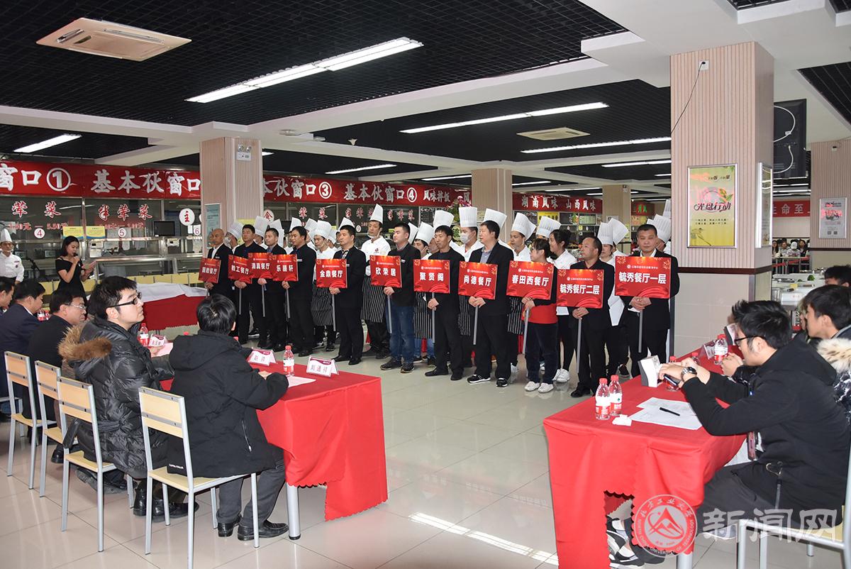 副校長胡應(yīng)平、校工會(huì)常務(wù)副主席張玉林、服務(wù)中心總經(jīng)理胡春江、服務(wù)中心黨委書記張加強(qiáng)、后勤基建處處長趙永兵、學(xué)工部副部長趙帥、校團(tuán)委副書記陳國秀、后勤基建處負(fù)責(zé)人以及100余名學(xué)生代表應(yīng)邀出席比賽。本次大賽共有11個(gè)代表隊(duì)37名選手參賽,基本伙食堂、風(fēng)味食堂、餐廳共11個(gè)廚藝展臺(tái)參展,參展菜品近百余種。為了保證比賽公開、公正、公平的進(jìn)行,本次大賽特別邀請我校伙委會(huì)5名學(xué)生代表擔(dān)任比賽評(píng)委。
