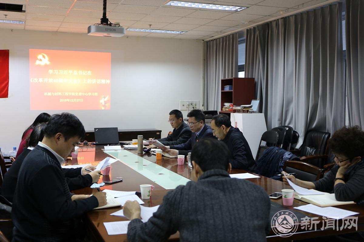 2018年12月27日下午,機(jī)械與材料工程學(xué)院黨委理論學(xué)習(xí)中心組在博聞樓203室召開學(xué)習(xí)會,集體學(xué)習(xí)習(xí)近平總書記《在慶祝改革開放40周年大會上的講話》精神。學(xué)院班子成員、黨委委員、系/中心主任、工會負(fù)責(zé)同志參加了學(xué)習(xí)。學(xué)習(xí)會由院黨委書記王文革主持。