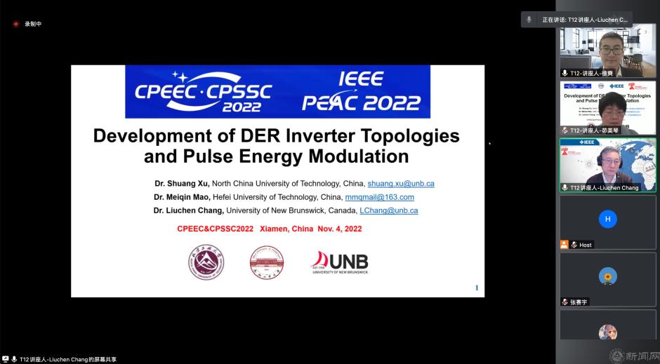 由中國電源學(xué)會主辦的2022中國電力電子與能量轉(zhuǎn)換大會暨中國電源學(xué)會第二十五屆學(xué)術(shù)年會及展覽會(CPEEC & CPSSC 2022)于2022年11月4日-7日在廈門召開,大會旨在促進(jìn)電力電子、能量轉(zhuǎn)換與電源技術(shù)相關(guān)領(lǐng)域?qū)W術(shù)、技術(shù)交流,促進(jìn)產(chǎn)、學(xué)、研的合作,促進(jìn)相關(guān)產(chǎn)業(yè)及產(chǎn)業(yè)鏈的技術(shù)創(chuàng)新和進(jìn)步,為國內(nèi)外專家學(xué)者分享領(lǐng)域內(nèi)最新研究成果提供交流平臺。我校電氣與控制工程學(xué)院徐爽博士受邀以北方工業(yè)大學(xué)為第一單位,同加拿大皇家工程院院士張榴晨教授、合肥工業(yè)大學(xué)茆美琴教授一起,以“Development of DRE Inverter Topologies and Pulse Energy Modulation”為主題,做了時長為三個半小時的線上特邀大會報告。