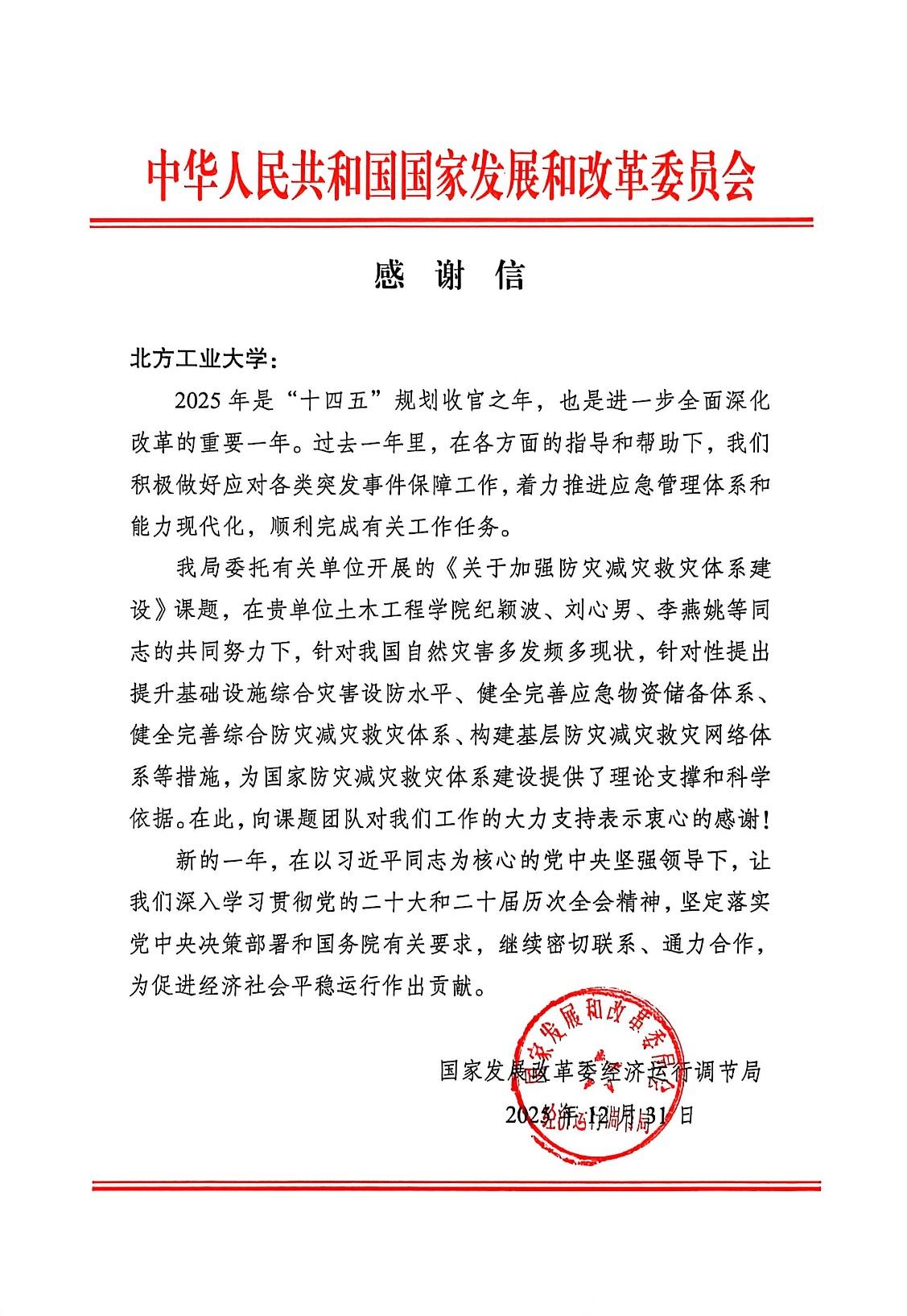 近日,國家發展改革委經濟運行調節局向我校發來感謝信,感謝我校紀穎波教授團隊為國家防災減災救災體系建設做出的理論支撐貢獻,表達深化合作愿景。