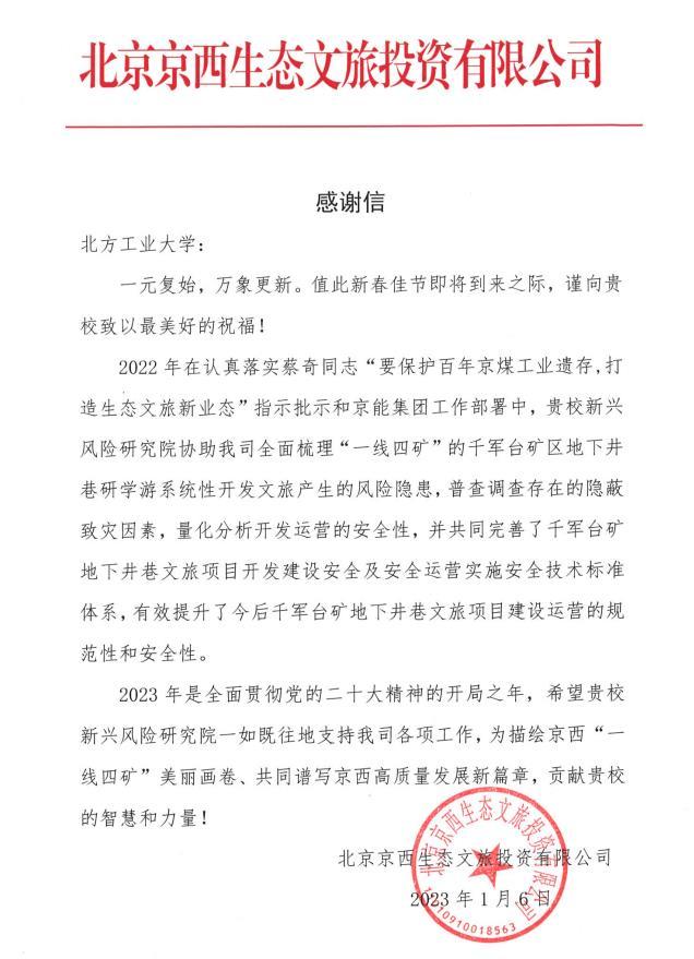 1月6日,北京京西生態(tài)文旅投資有限公司向我校發(fā)來感謝信,感謝我校新興風(fēng)險研究院過去一年為門頭溝“一線四礦”項目提供的技術(shù)支撐服務(wù)。