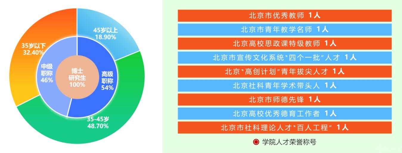 在學(xué)校大力支持下,思政課專職教師數(shù)量穩(wěn)步提升,由2021年27人增至2025年35人,師資結(jié)構(gòu)不斷優(yōu)化,專職教師全部具有博士學(xué)位,45歲以下中青年骨干教師占比87%。思政課教師職稱評審實現(xiàn)“三單”,高級職稱比例上升近20個百分點。學(xué)院通過落實“一師一檔”工作機制,開展“教學(xué)展示暨點評一堂課”等活動,著力提升思政課教學(xué)水平和育人能力,取得了顯著成績。近5年,學(xué)院教師先后榮獲北京市優(yōu)秀教師、北京市“高創(chuàng)計劃”青年拔尖人才等稱號,斬獲北京高校教書育人“最美課堂”一等獎、北京高校青年教師教學(xué)基本功比賽特等獎等市級及以上榮譽10余項。