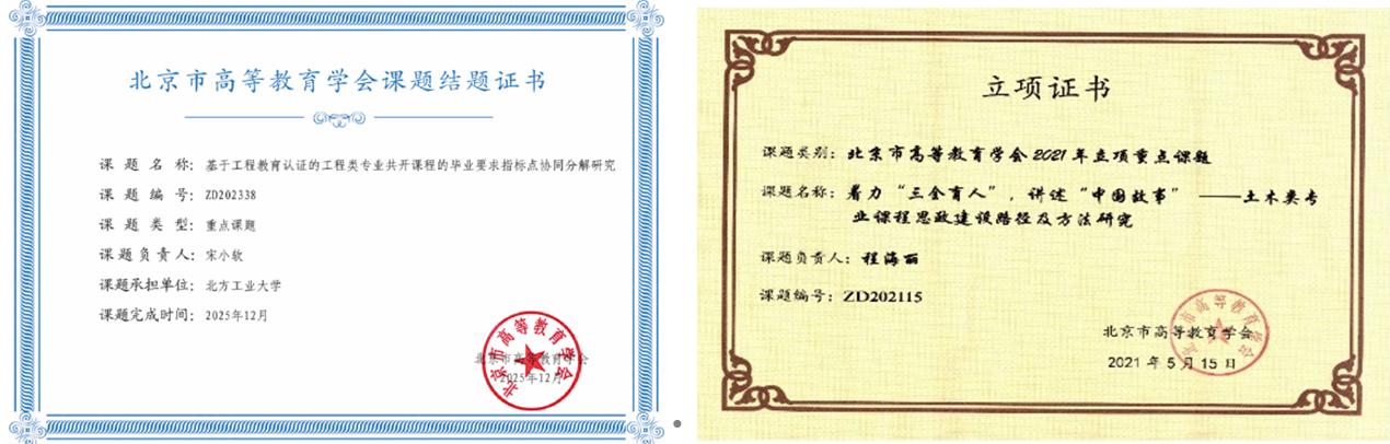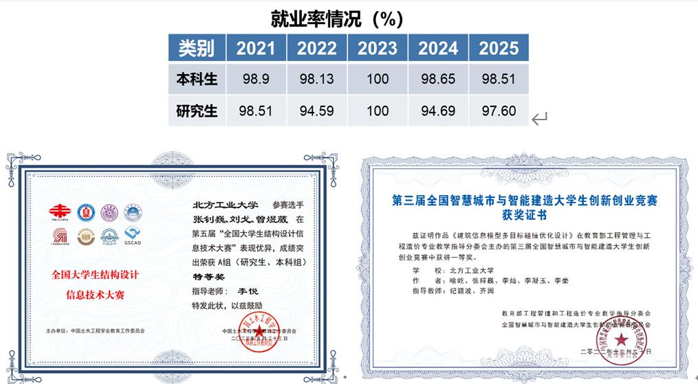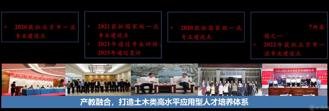 專業建設及轉型發展成效顯著。對標國家重大戰略和行業轉型升級需求,對傳統土木類專業進行智能化、信息化升級改造。新增1個國家級一流專業建設點(工程管理)、2個北京市一流專業建設點(智能建造、土木工程),工程管理專業2021年通過住建部專業評估認證并于2025年通過復評。新設置的智能建造專業已順利培養3屆畢業生,實踐教學水平走在全國前列;依托地空專業新申報了“智慧應急”專業;設置了“韌性城市安全與風險防控”和“建筑節能與低碳設計”(與數字產業學院共建)兩個微專業。