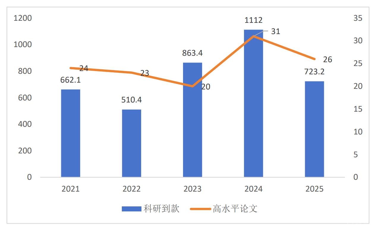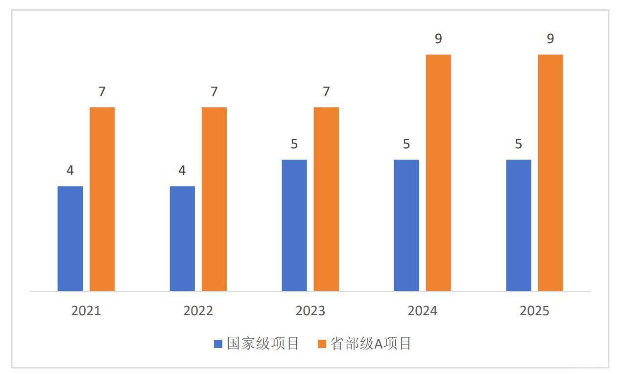 “十四五”期間,到款科研經(jīng)費(fèi)合計3871.1萬,較“十三五”時期增長48.3%,其中橫向經(jīng)費(fèi)2811.6萬,增長53.7%,縱向經(jīng)費(fèi)1059.5,增長35.8%。年度到款額在2024年首次突破1000萬元,科研經(jīng)費(fèi)規(guī)模與結(jié)構(gòu)持續(xù)優(yōu)化。“獲批國家級課題23項,省部級A類課題39項。以第一單位申報獲批的國家社科基金項目從“十三五”期間的1項增至11項;省部級以上采納智庫成果從2項增至21項。